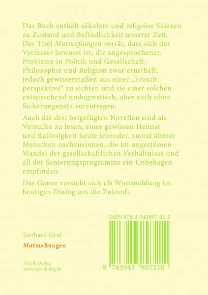 Das Buch enthält säkulare und religiöse Skizzen zu Zustand und Befindlichkeit unserer Zeit. Der Titel Mutmaßungen verrät, dass sich der Verfasser bewusst ist, die angesprochenen Probleme in Politik und Gesellschaft, Philosophie und Religion zwar ernsthaft, jedoch gewissermaßen aus einer "Froschperspektive" zu sichten und sie einer solchen entsprechend undogmatisch, aber auch ohne Sicherungsnetz vorzutragen. Auch die drei beigefügten Novellen sind als Versuche zu lesen, einer gewissen Heimat- und Ratlosigkeit heute lebender, zumal älterer Menschen nachzusinnen, die im ungestümen Wandel der gesellschaftlichen Verhältnisse und all der Sanierungsprogramme ein Unbehagen empfinden. Das Ganze versteht sich als Wortmeldung im heutigen Dialog um die Zukunft. von Graf, Gerhard